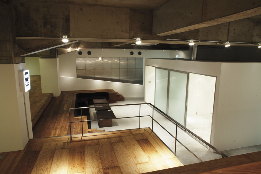 2010年の本社移転に際し新たにデザインしたオフィス。壁の無い100坪の区画を出来るだけオープンに使うためフロアの高低差を活用してゾーニングをしています。個性的なフロアプランや素材の使い方、アート作品の活用はゲストに対しSmilesの価値観を語らずに伝える場となっています。